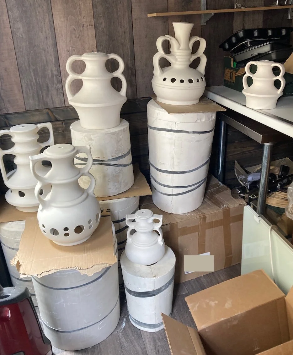 A few of the moulds came with bisque-fired models, so we already know what they look like. But some didn’t, so it’s going to be a bit of a surprise when we finally cast them. I found these moulds by complete chance. We’ve been making new lampshades for customers with old West German Fat Lava Lamps for many years, but this is a bit of a new adventure for us, and it’s super exciting!
